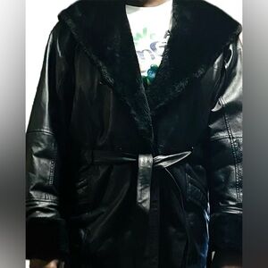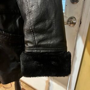 Elegant Black Leather Faux Fur Trimmed Women's Coat