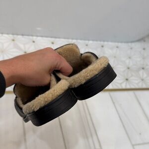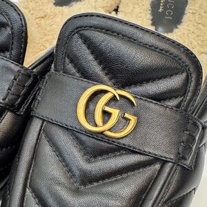 Luxurious black quilted leather slides with fur lining. Features iconic Gucci brushed gold emblem.