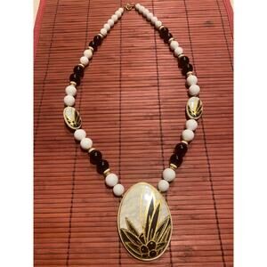 Black and cream with gold accents on this beautiful statement necklace! Large, 3 inch ceramic pendant with two smaller matching within the beads.