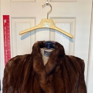 Luxurious brown fur coat by LeNobel Furs. Perfect for elegant occasions… This REVERSIBLE mink coat is 47” long, sleeves are 20” from top of arm (approx 3/4” sleeves). This coat has perhaps been worn 5 times max. It comes with original cover. IF YOU ARE INTERESTED AND WANT TO MAKE AN OFFER - - be reasonable. This is a true GEM.
