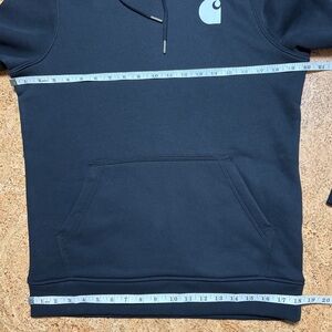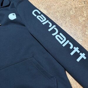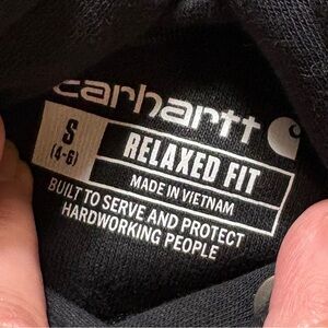 Carhartt Wm’s Relaxed Fit Midweight Logo Sleeve Fleece Hoodie In Black Sz S(4-6). New without tags. Pullover style. Front Kangaroo pocket with inner pocket. 3 piece hood with drawstrings. Rib knit cuff & bottom hem. Black with white arm spellout & logo on chest. Cozy fleece lining. Great new condition