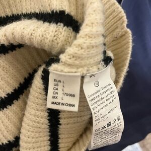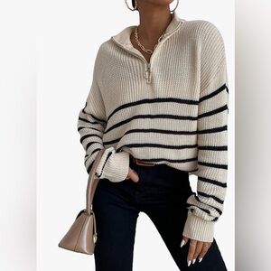 🔍 Keywords: striped half zip sweater, cream black stripe sweater, coastal granddaughter aesthetic, preppy knit sweater, chunky knit pullover, neutral sweater L, collared sweater, French girl style, half zip pullover