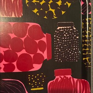 Stylish Marimekko tray with bold red and black design. Features abstract patterns. Perfect for serving. 13” x 17”