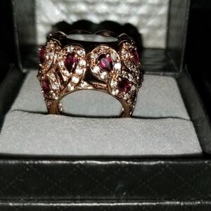 One of a kind exquisite ladies ring. Large center green sapphire with amethyst teardrop stones and genuine diamond accent stone. This ring is a showpiece, the workmanship and design are detailed and beautiful. This ring was purchased at a very high end jewelry boutique in downtown Dallas Texas. Marked 925.
