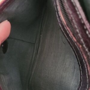 Stylish wallet with a colorful geometric pattern. Features shades of red, green, and tan.