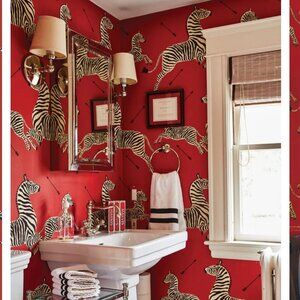 5 unopened rolls, 8 yards long, plus one partial roll (opened) 3.7 yards of Scalamandré zebra wallpaper in the Masai red color. This not the peel and stick version, rather the traditional wallpaper. Purchased for $250 a roll, this would retail for $1,250. My paper hanger over ordered. This should be more than enough to cover a powder room, which is what we used it for.