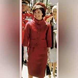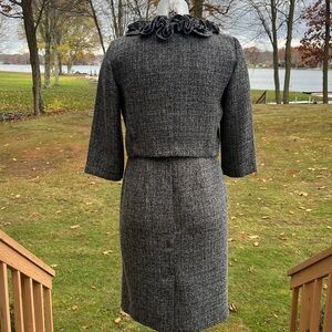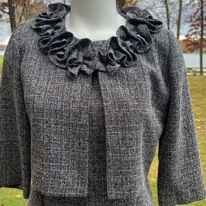 This elegant vintage 90’s black & white tweed set is channeling Jackie Kennedy’s stylish look. The lined sheath dress is marked 6P but is shown on a size 8 mannequin. The cropped box style jacket has 3/4 sleeves and a charming ruffle around the neckline. In fine condition. The sophisticated retro design offers a timeless look.