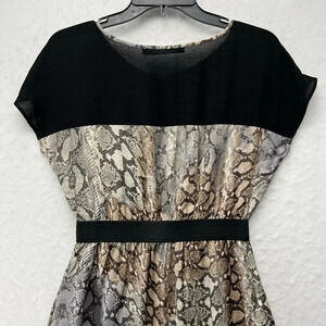 Zara Basic Dress Women's M Brown Black Snake Print Round Neck Elastic Waist Mini