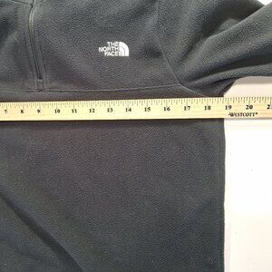 Lightweight black The North Face fleece pullover with a 1/4 zip neck, soft fleece, long sleeves. White The North Face embroidery on the left chest. Material: 100% polyester Size Women's M For measurements, see photos 6, 7, 8 & 9. In very good condition. No holes, snags, pilling, stains, or discoloration. Smoke-free and pet-free home.