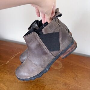 Gorgeous waterproof leather ankle boots by Sorel. The original cult favorite “Emelie Chelsea” style in "Quarry" (a taupe grey with black elastic strap). Shaft height 4” measured at side, heel height 1.25“. Size 8.5, great preowned condition with some distressing to leather finish & signs of wear at heels.