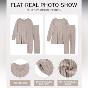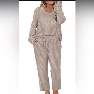 Relax in style with this cozy ribbed knit lounge set. Features a comfortable top and matching pants in a neutral beige color.