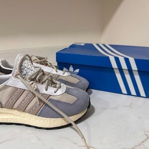 Stylish adidas athletic shoes for women. Features a gray upper with cream accents. Comfortable and trendy design. Adidas (WMNS) Retropy E5 ‘Aluminium Silver Violet’ – Size 5.5. Runs slightly big, fits like a regular women’s size 6.5.