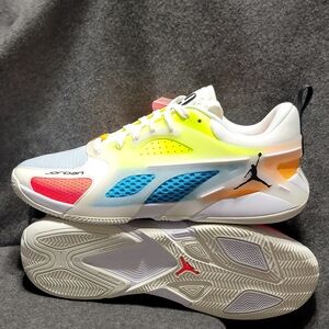 Nike Precision 6 basketball shoe in a black, sail, and volt colorway.