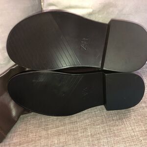 Zara over-the-knee brown flat boots in size 7.5 (EU 38). These boots feature a flat rubber sole, brown vegan leather, and a side zipper closure.