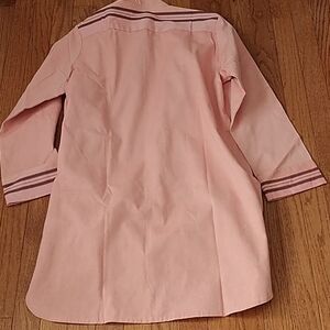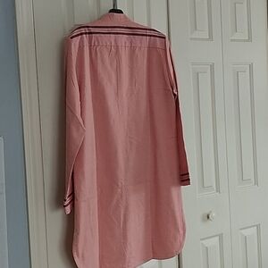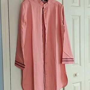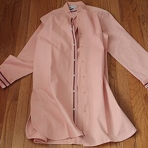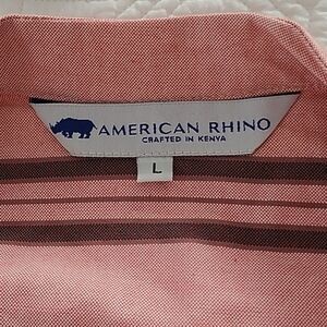 American Rhino, Shirt Dress, Kenyan Cotton. Sz L. Shirt tail sides, Button front with trim. Trim on cuffs also. Trim on back shoulders. 100% Kenyan Cotton, Made in Kenya. Brand new no tag. So Cute. All American Rhino apparel is unique made from quality material from Kenya. This is a peachy/pinkish color with a cranberry trim.