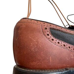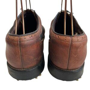 Allen Edmonds Honors Collection 1 UP Golf Shoes, brown leather with fabric, wing tip toes, lace up, leather lining, cleats, men's 9.5 D, preowned and shows wear on the soles, scuffs/scratches throughout, wear on the collar - see photos