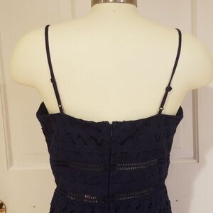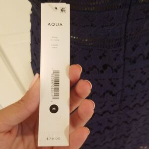 New with tags Aqua navy lace midi dress. Has gorgeous lace overlay with see through area right around the natural waist shown in figure 3. Adjustable spaghetti straps. Lace overlay extend 5" over the under layor. Has a little stretch to it. Bust 16.5", waist 14", hips 18", length armpit to hem 34".