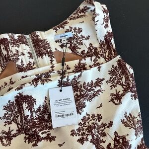 Elegant strapless top with intricate brown toile design on cream fabric. Ideal for a sophisticated style.