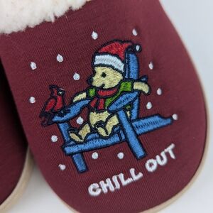 Soft textile upper with embroidered small bear in a chair, snow flakes, cardinal and the words CHILL OUT to complete this adorable winter theme scene. Faux sherpa trim. Cushioned textile footbed. TPR and textile outsole. Slip on style.