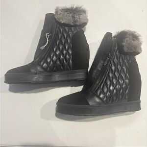 Elegant black boots with quilted design. Cozy faux fur trim. Perfect for winter style.