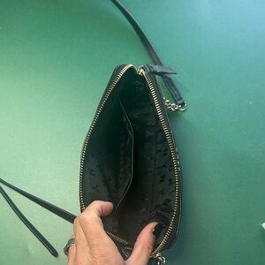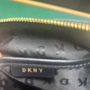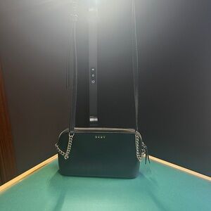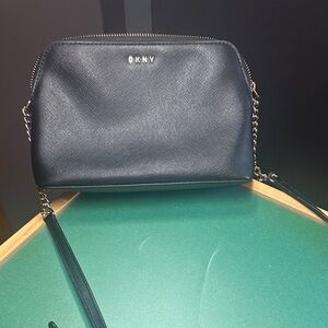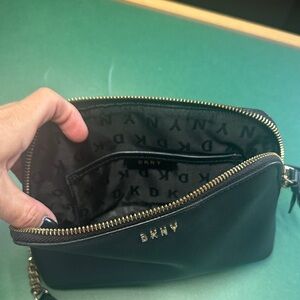 Chic black crossbody bag by DKNY. Features a stylish gold chain strap. Perfect for day or night.