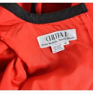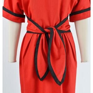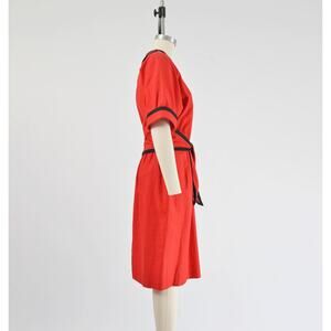 Vintage 1980's red and black dress Linen/cotton blend fabric. Dolman sleeves. High waisted. Ties at front. Sheath silhouette. Rear zipper. Lined.