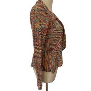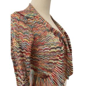 This vibrant open cardigan by American Rag features a multicolored wave-knit pattern with an array of warm and cool hues, including reds, greens, yellows, and blues. The lightweight fabric makes it perfect for layering year-round.