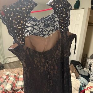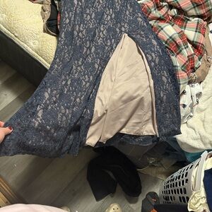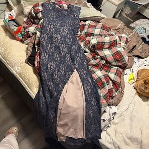 Elegant navy lace dress. Features a stylish design. Perfect for prom or special occasions.