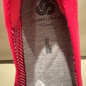 Barely worn beautiful, comfy red canvas type espadrille shoe by Clark's Cloudsteppers. Light cream colored rubber bottom and side whip stitching. Size 8 M Note: cover picture shows a shadow while taking the photo. It is not a stain on the shoe.(first photo)