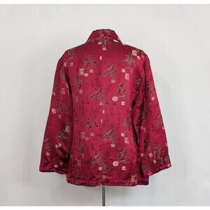 Item: Blouse Size: Chico's 2/Misses large Brand: Chico's Fabric Content: 77% rayon/23% silk Description: * Burgundy red with black, gold and gray Asian inspired pattern * Pointed collar * Front button closure * Long sleeves with rolled cuffs Measurements: Length: 27 inches, Chest: 40 inches, Sleeve Length: 21 inches Condition: Pre-owned condition. No holes, stains or tears.