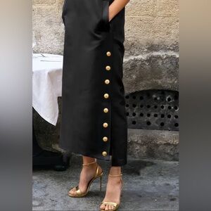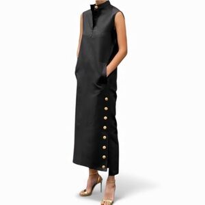 This sophisticated black sleeveless dress features striking gold button accents along the side. Perfect for any occasion, it combines elegance with a modern touch.