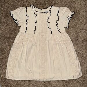 Adorable cream dress with all over floral and bee print. Features button-down front and ruffle sleeves. This is the original 2023 Litho Bee that had ink quality issues, so some yellow ink has washed off in places on the bottom tier.