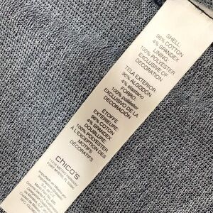 Knit with 4% spandex for good stretch, denim blue color, lots of detail with red piping, blue/gold braiding, faux breast pocket, full gold metal buttons up front, plus real pockets, long sleeves with more trim, Chico’s Zenergy, Chico’s size 1=M/8, measured flat unstretched app: pits 20.5”, shoulder to hem 24”, good condition (T-93)