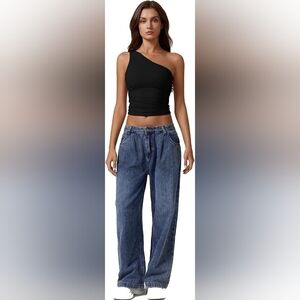 Step out in style with this elegant black one-shoulder crop top. Perfect for a night out or casual day wear, it offers a sleek and modern look. Thanks for looking and have a great day.