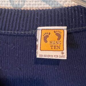 Add a bold retro piece to your wardrobe with this vintage 1980s Hang Ten pullover sweater. Known for its surf and skate roots, this eye-catching knit features vibrant horizontal rainbow stripes on a deep navy background, finished with iconic embroidered footprints. A rare find in great vintage condition!