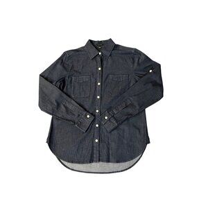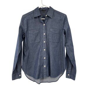 ann taylor, womens blouse, size 0, chambray shirt, denim look, button down, long sleeve, cotton spandex, office blouse, casual shirt, workwear, classic style, blue top, collared blouse, machine washable, modern fit, timeless basics, Spring, Fall
