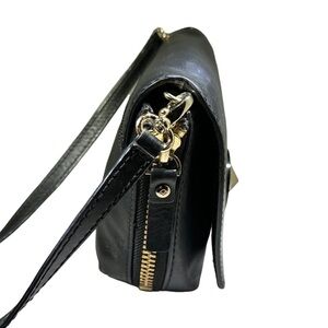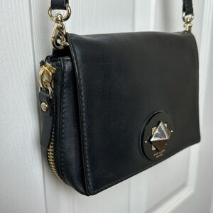 KATE SPADE NEW YORK Crossbody Bag with 100% Calf Hair inserts & side zippers • Shoulder or Crossbody style • 100% genuine leather & calf hair • Unique gold color pyramid turn lock • Approx 8”W x 6”H x 2”D • Minor scratches on clasp & bottom corner • Good used condition