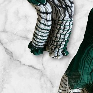 Easy, breezy boho tiered maxi dress in soft, flowy crinkle gauze. Pullover style with ruffle collar, open v-neckline, covered buttons, and tasseled string tie. Separate solid green slip with adjustable spaghetti straps. Long sleeves feature elasticized cuffs. Abstract stripe motif pattern.
