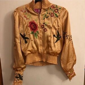 The “just peachy” bomber jacket by Free People. Peach satin adorned with beautiful embroidered flowers and birds. It has fitted cuffs, a high neck, pockets, and a zipper.
