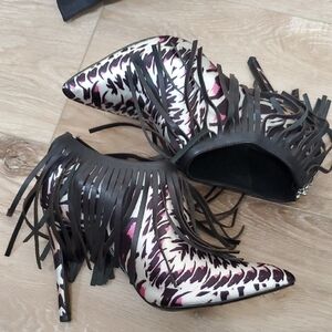Gorgeous satin animal print boots with black leather fringe, silver zip ip back. 4" heels.