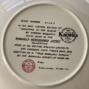 Here's a classic Rockwell collector plate entitled "Gossiping in the Alcove." Issued in 1983, sixth issue in the Rediscovered Women Series. Approved by the Rockwell Society of America and crafted by Knowles China in an edition strictly limited to a maximum of 100 firing days. Numbered and signed. It's 8 1/2" wide and in excellent condition. Smoke free home.