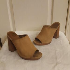 Frye Karissa Mule Camel Tan Suede Wood Chunky Block Heel Size 8.5 Boho