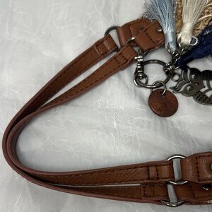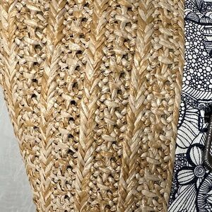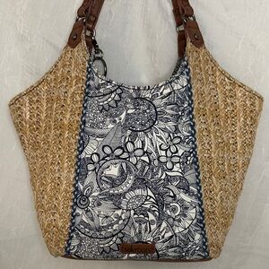 Stylish Sakroots tote with intricate black and white design. Features tan woven texture and brown handles. Includes decorative tassel charm.