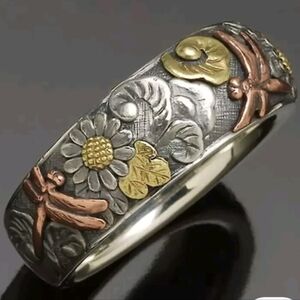 Beautiful Dragonfly with Sunflowers Ring Size 10 Tibetan Silver