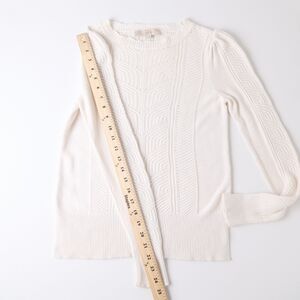 Soft and feminine, this Loft white crochet knit sweater features a delicate textured pattern with subtle puff sleeves and ribbed trim for an elevated yet cozy look. Made from a breathable cotton blend, this long-sleeve pullover is perfect for layering in fall and winter or wearing on its own for a chic, effortless style. Ideal for pairing with high-waisted jeans or skirts for a romantic, vintage-inspired aesthetic.