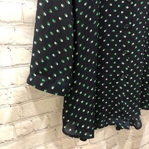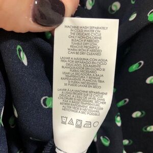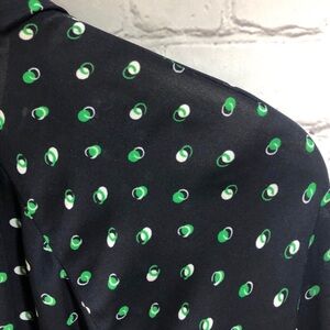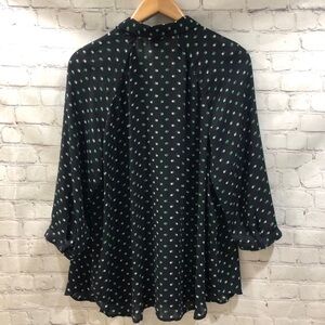 Features: navy blue, green and white, 3/4 length sleeves, button front, spread collar, polka dot print in fun olive style, v neck, semi sheer, tunic length, swingy blouse
