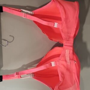 Experience the perfect blend of comfort and style with this Victoria's Secret bra, featuring molded cups for a seamless silhouette. The vibrant coral color and floral lace with matching smooth sheen straps ensure a sleek look that adds a touch of elegance.