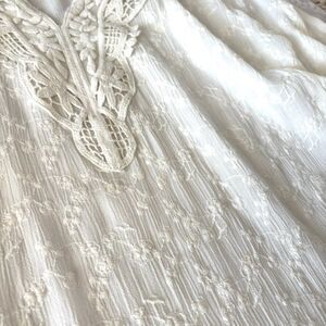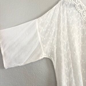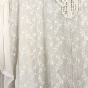 Light and airy, tunic-style top with embroidery accents, featuring a crocheted neckline, floral embroidery and a hint of sparkle with transparent sequins throughout the embroidery. Sheer fabric. 3/4 sleeves.