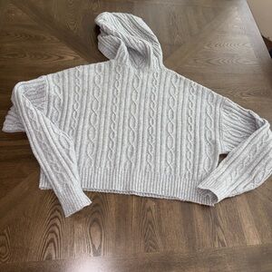 In very good used condition ALO Yoga Cable Knit Winter Bliss Cropped Hoodie Long Sleeve Athletic Heather Gray with some minor signs of normal wear