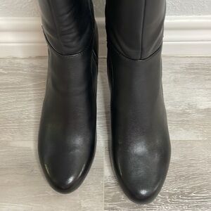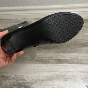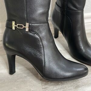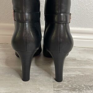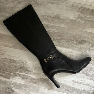 Elegant black heeled boots. Sleek design with silver buckle detail. Perfect for any occasion.